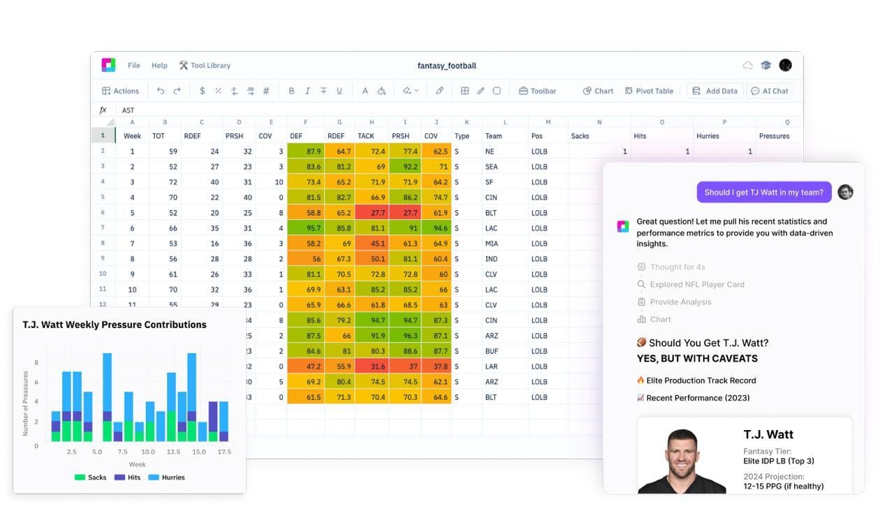 This NFL season, fantasy football is getting a cold, calculated upgrade. Sourcetable, the world’s first spreadsheet built for AI-native analysis and data science, is launching the AI Fantasy Sports Analyst, built to help you crush your draft, demolish your friends, and win your league before Week 1 even kicks off.